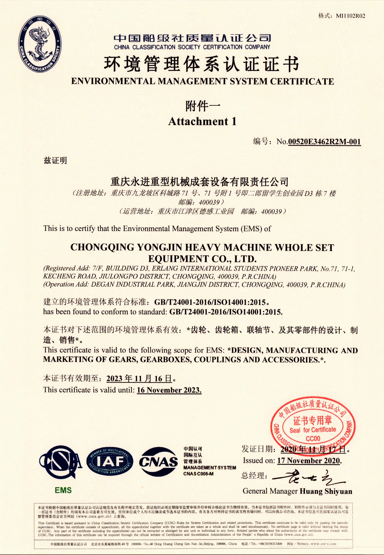 環境管理體系認證證書